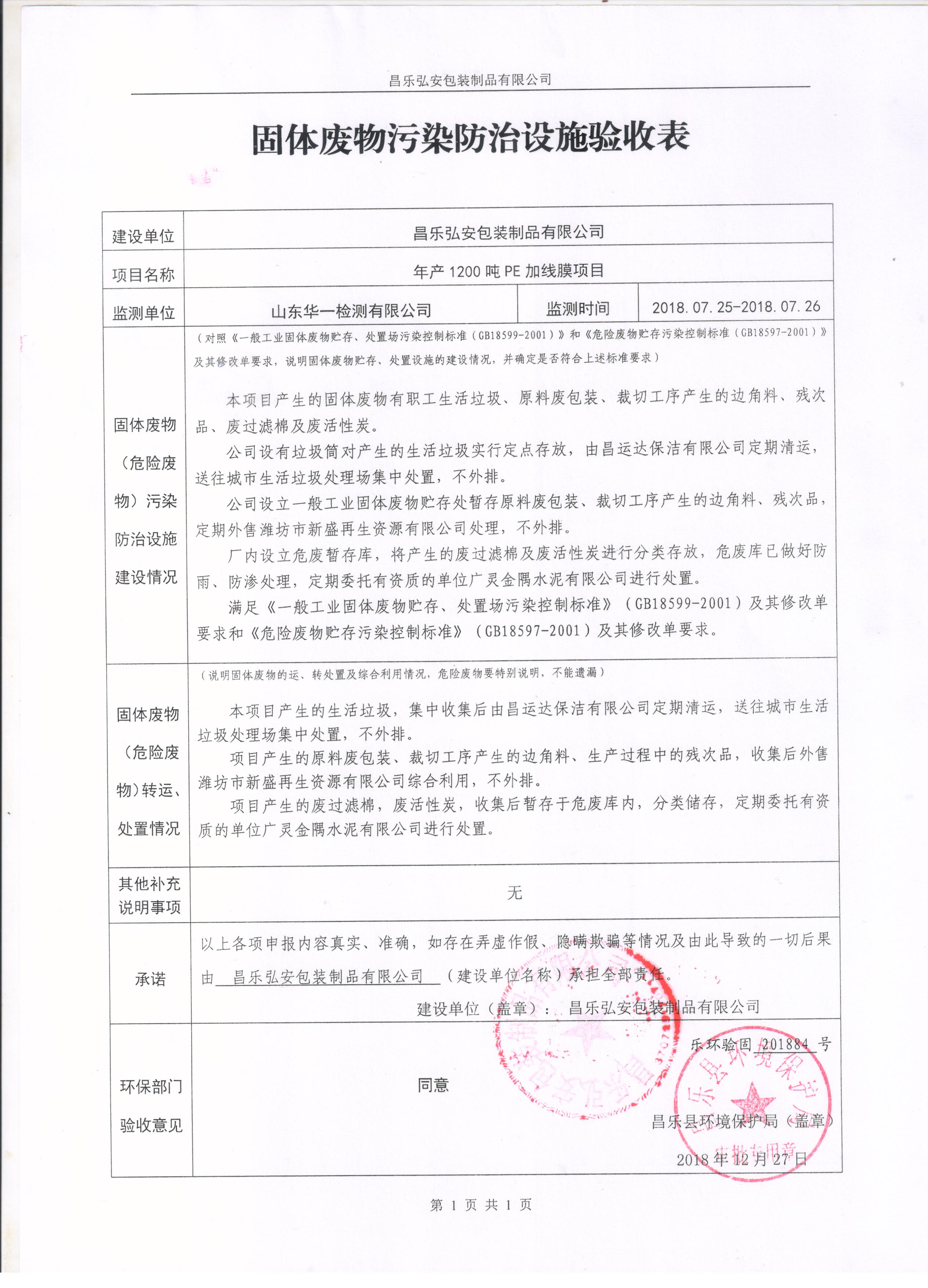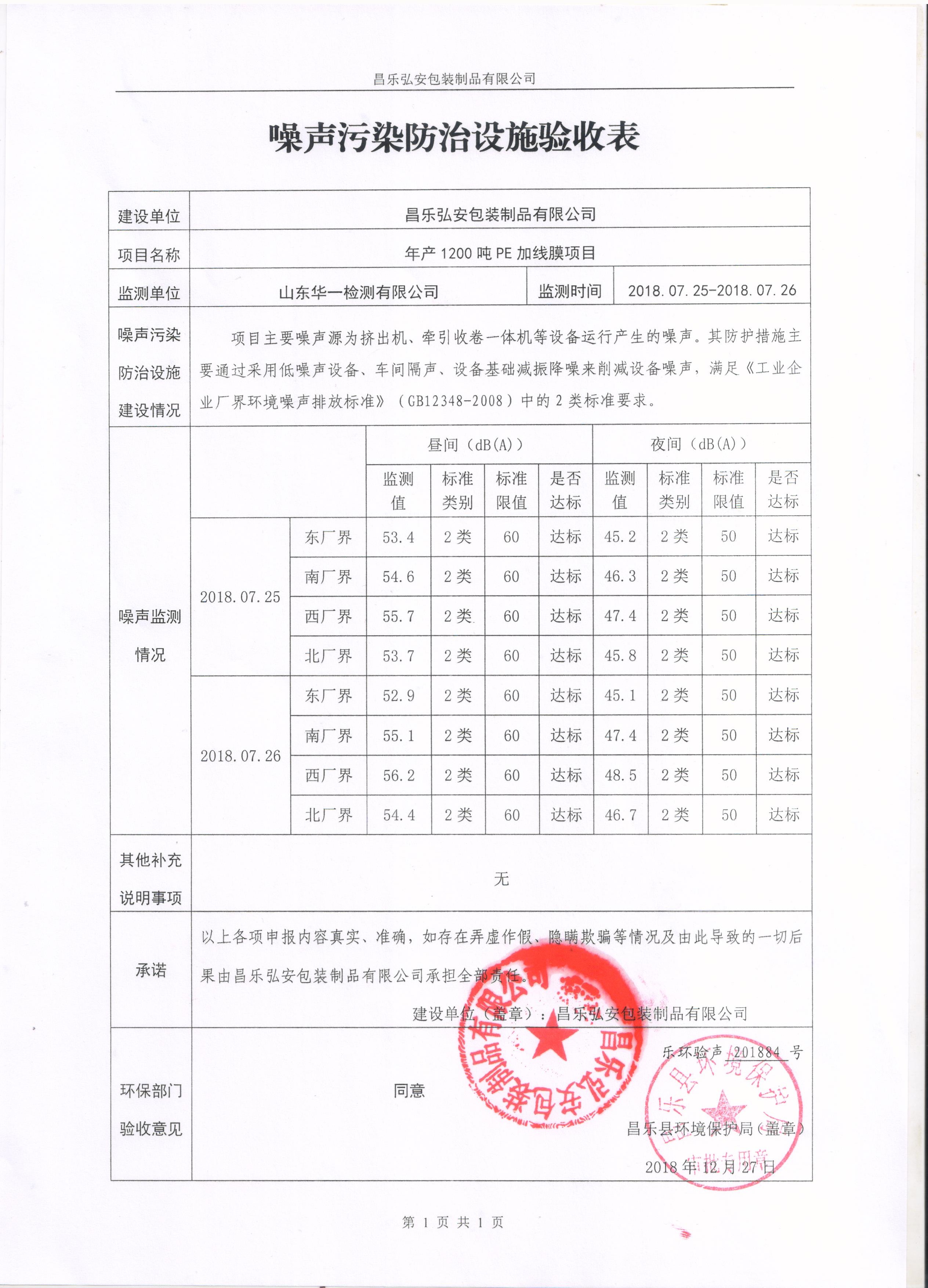 2018年11月09日,昌乐弘安包装制品有限公司组织了“年产1200吨PE加线膜项目”竣工环境保护验收现场检查会。参加会议的有竣工环境保护验收检测单位、竣工环境保护验收检测报告表编制单位-山东华一检测有限公司、建设单位的代表,并邀请了2名专家。验收会成立了项目竣工环境保护验收组。验收组听取了建设单位关于环保执行情况的介绍和验收单位关于竣工环境保护验收调查情况的汇报,现场检查了项目及环保设施的建设及运行情况,审阅并核实了有关资料。